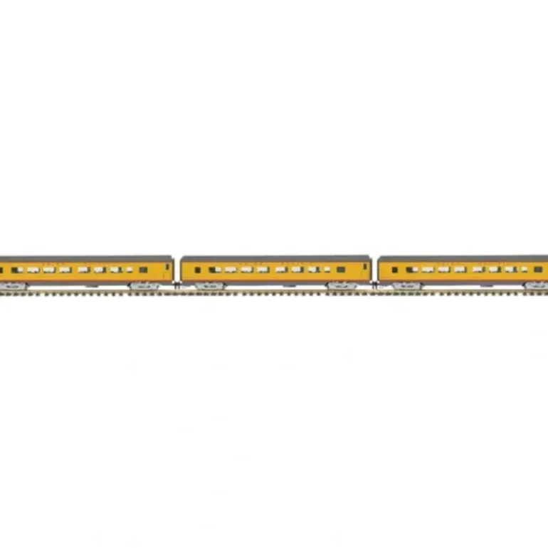 Here is an MTH 70-65021 Union Pacific 3-Car Passenger Car Set. Features include Durable Intricately Detailed Polycarbonate Bodies, Detailed, Sprung 4-Wheel Trucks, Choice Of Knuckle or Hook & Loop Couplers, Colorful, Attractive Weatherproof Paint, End-of-Car Diaphragms, Separate Metal Handrails, Metal Wheels and Axles, Opening Car Doors, Detailed Car Interiors, Operating Overhead Interior Lighting, 1:32 Scale Height and Width, Detailed Car Undercarriage, 3-Car Sets Feature (3) Coaches, Unit Measures:85 1/2 x 3 3/4 x 5, and Operates On R1 Curves.