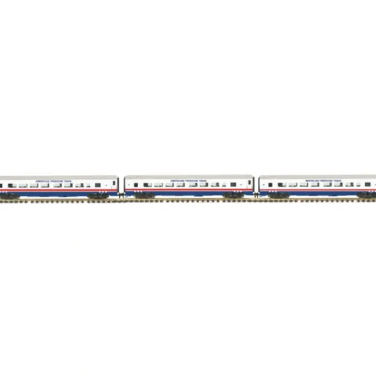 This is a MTH 70-65022 Freedom 3-Car Passenger Set. It’s hard to match the excitement and beauty of a long, sleek passenger train speeding down the rails, and RailKing One-Gauge streamlined passenger cars and sets will bring that drama to your 1/32 railroad. No other manufacturer matches the quality and value found in a RailKing One-Gauge passenger car. An intricately detailed, yet durable polycarbonate body atop smooth-rolling sprung trucks results in a lightweight but track-hugging car that won’t bog down a locomotive. Stainless steel wheels and axles and your choice of two coupler styles ensure years of operation and compatibility. What’s more, each passenger car features a detailed interior, opening doors, and overhead lighting for a realistic appearance. Features include Durable Intricately Detailed Polycarbonate Bodies, Detailed, Sprung 4-Wheel Trucks, Choice Of Knuckle or Hook Loop Couplers, Colorful, Attractive Weatherproof Paint, End-of-Car Diaphragms, Separate Metal Handrails, Metal Wheels and Axles, Opening Car Doors, Detailed Car Interiors, Overhead Interior Lighting, 1:32 Scale Height and Width, Detailed Car Undercarriage, 3-Car Sets Feature (3) Coaches, Unit Measures:85 1/2 x 3 3/4 x 5, Operates On R1 Curves.