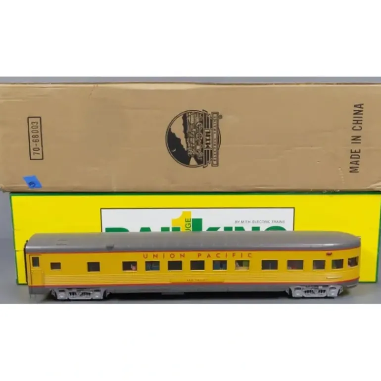 This is an MTH Union Pacific 70-68003 Streamlined Passenger Observation Car – Ribbed, Sun Valley. Features include Durable Intricately Detailed Polycarbonate Bodies, Detailed, Sprung 4-Wheel Trucks, Choice Of Knuckle or Hook & Loop Couplers, Colorful, Attractive Weatherproof Paint, End-of-Car Diaphragms, Separate Metal Handrails, Metal Wheels and Axles.