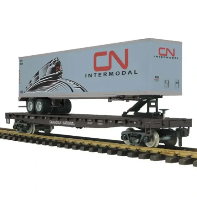 Here is an MTH 70-76052 Canadian National Flat Car w/45′ Trailer. Features include metal wheels, axles, detailed durable polycarbonate body and knuckle look and hook couplers.