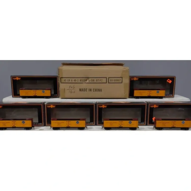 Here is an MTH 80-90002 Pacific Fruit Express 6-Car R40-2 Reefer Set. Features include Intricately Detailed Durable ABS Body, Metal Wheels and Axles, Decorative Brake Wheels, Separate Metal Handrails, 1:87 Scale Dimensions, Kadee Compatible Couplers, Detailed Undercarriage, Fully Sprung Die-Cast 4-Wheel Metal Trucks, and Each Car Individually Numbered.
