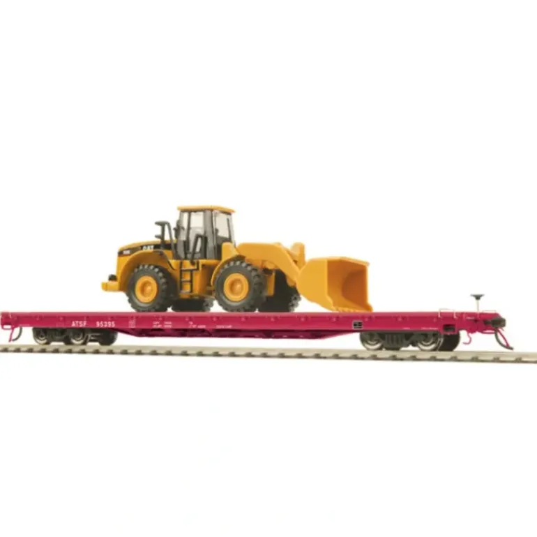 This is an MTH 80-98013 Santa Fe 60′ Wood Deck Flat Car w/950G Wheel Loader. Between 1964 and 1975, Trailer Train (now known as TTX Co.) acquired a fleet of 5,000 modern 60′ flat cars. Similar cars are rostered by most major U.S. railroads. Bult by ACF, Thrall, and Pullman Standard, the TTX cars were assigned to various classes to handle loads as diverse as auto frames, logs, military vehicles, farm equipment, and construction equipment. Some were even modified to handle TTX’s bread and butter, intermodal containers.