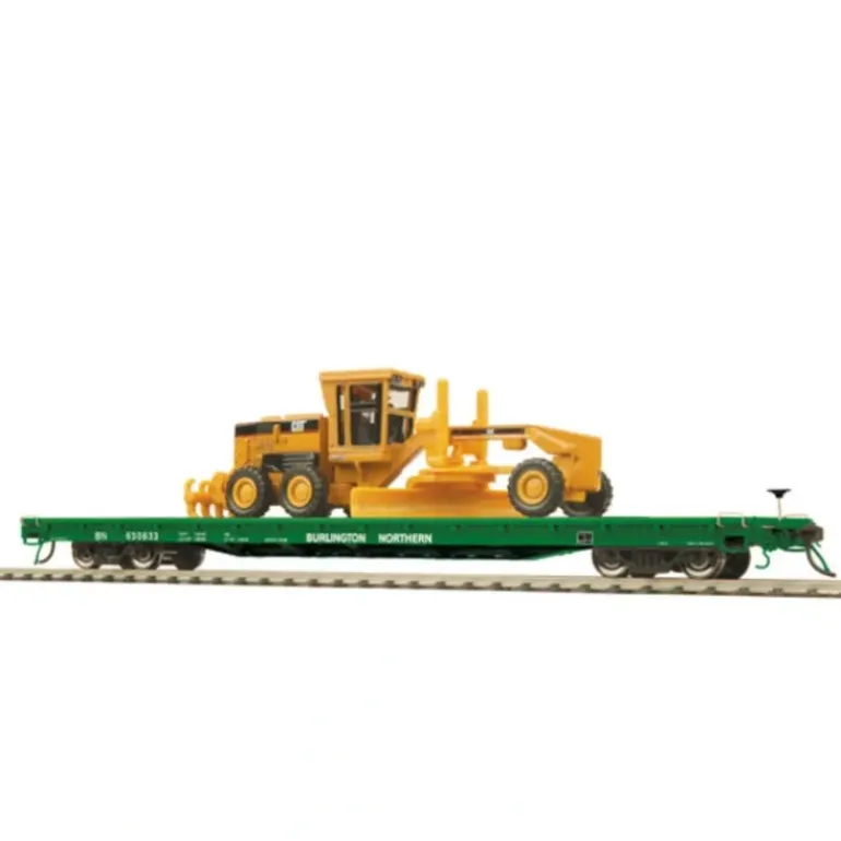 This is an MTH 80-98018 Burlington Northern 60′ Wood Deck Flat Car w/163H Motor Grader. Between 1964 and 1975, Trailer Train (now known as TTX Co.) acquired a fleet of 5,000 modern 60′ flat cars. Similar cars are rostered by most major U.S. railroads. Bult by ACF, Thrall, and Pullman Standard, the TTX cars were assigned to various classes to handle loads as diverse as auto frames, logs, military vehicles, farm equipment, and construction equipment. Some were even modified to handle TTX’s bread and butter, intermodal containers. Our model is based on TTX class F60GH cars built in the mid-1970s by Pullman Standard. Equipped with four rows of tie-down tracks, two astride the center sill and one along each side, these wooden-decked cars are assigned to heavy-duty equipment service. Our model replicates the prototype’s intricate details and is offered with several appropriate loads of heavy machinery. Features Include: Intricately Detailed Durable ABS Body,Metal Wheels and Axles,Operating Roller Bearings, Decorative Brake Wheels, Separate Metal Handrails, 1:87 Scale Dimensions, Simulated Wood Decking, Kadee Compatible Couplers, Detailed Undercarriage, Fully Sprung Die-Cast 4-Wheel Metal Trucks, (1) 163H Motor Grader, Unit Measures:8 7/8 x 1 1/2 x 3/4, Operates On 18 Radius Curves.
