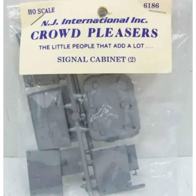 This is a NJ International 6186 Signal Cabnets (Pack of 2). They are silver and are for HO scale use.