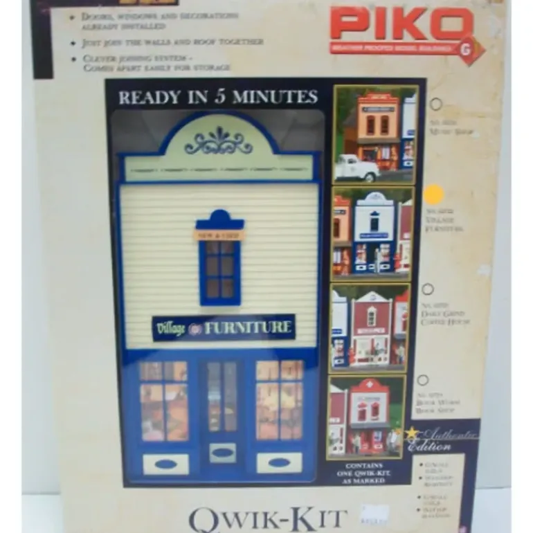 The Qwik-Kit buildings come partially assembled, to give beautiful results in almost no time. Windows, doors, signs and details are already installed. A unique pin system joins each building solidly together in minutes – and allows it to come apart again. Dimensions: 5.6 x 8 x 9.8″