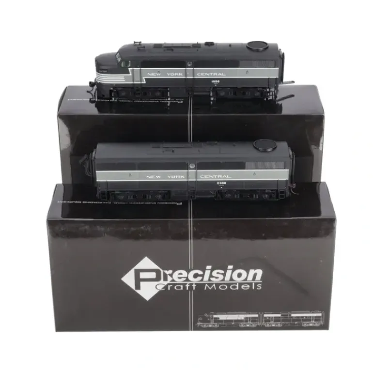Here is a Precision Craft Models 263 HO NYC ALCO FA/B Diesel Set #1000/2300 w/ DCC & SND. These cars feature plastic construction, headlight, a motor, DCC controls, sounds, plastic trucks, metal wheels and axles, and knuckle couplers.
