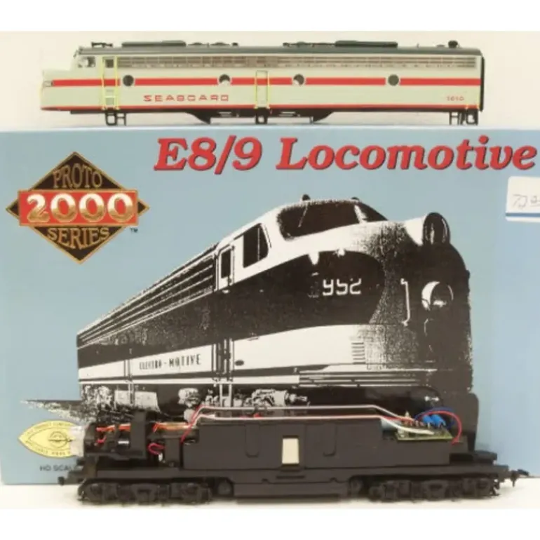 Here is a Proto 2000 21009 Seaboard E8/9 Diesel Locomotive. This A unit is numbered 3050 and features a DC motor with superrite anisotropic magnets, 5-pole skew wound armature motor with low amp draw, die cast chassis for maximum traction, 12-wheel electrical pickup, dual machined brass flywheels, sprung trucks, working diaphragm, detailed cab interior with crew, magnetic knuckle couplers, and constant and directional lighting with lighted number boards.