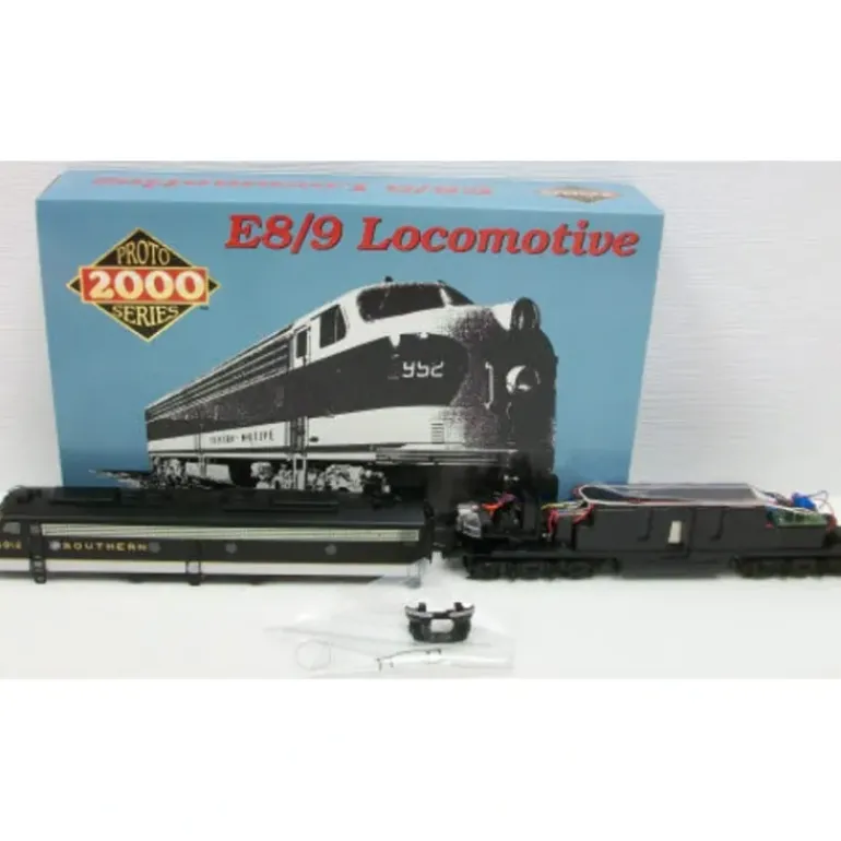 Here is a Proto 2000 21012 HO Scale Southern E8/9 Diesel Locomotive #6912. Features include finely crafted handrails, heavy die-cast chassis, DC motor with superrite anisotropic magnets, sintered bronze oiless bearings, 5 pole skew wound balanced armature motor with low amp draw, spring action trucks with enhanced 12-wheel electrical pickup, dual machined brass flywheels, operating knuckle couplers, and frame mounted universal coupler pockets.
