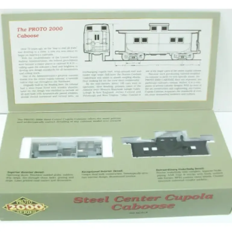 Here we have a Proto 2000 8244 Life Like HO Undecorated Center Cupola Illumintaed Caboose Kit. This item features plastic construction, horn hook couplers, interior lighting, & metal wheels. This kit features easy to assemble pieces and detailed instructions.