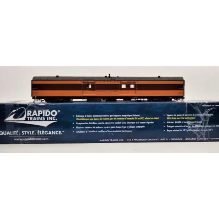 This is a Rapido Trains 106147 HO Scale Milwaukee Road Super Continental Line(TM) 73′ 6 Smooth Side Baggage-Express Car #1104 (1950 Scheme).Based on prototypes constructed in Canada by National Steel Car, these cars are very similar to cars used by a number of U.S. roads. Features include full underbody details and piping, separately applied wire grab irons and handrails, hand brake chains, battery-operated interior lighting, operating baggage doors, interiors and different door styles as appropriate.