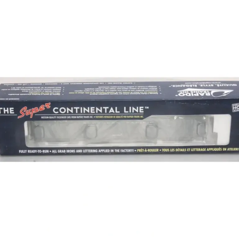This is a Rapido Trains 106083 HO Scale Southern Pacific Super Continental Line(TM) 73′ 6 Smooth Side Baggage-Express Car #6642 (gray).Based on prototypes constructed in Canada by National Steel Car, these cars are very similar to cars used by a number of U.S. roads. Features include full underbody details and piping, separately applied wire grab irons and handrails, hand brake chains, battery-operated interior lighting, operating baggage doors, interiors and different door styles as appropriate.