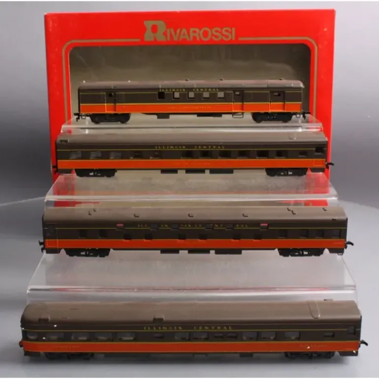 This is a Rivarossi 6953 HO Illinois Central 1930s 4-Car Passenger Set (Set B). Included is an RPO car, a roomette car, duplex sleeper car and a tail car. These cars feature detailed plastic trucks, horn hook couplers, metal wheels and axles.