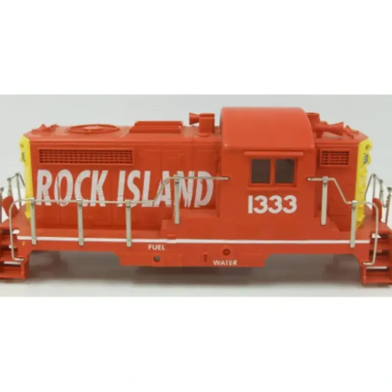 This is a RMT 4401 O Gauge Rock Island BEEP Diesel Loco Shell #1333. Features include a factory painted plastic shell, motor, lights, operating knuckle couplers, and metal wheels and axles.