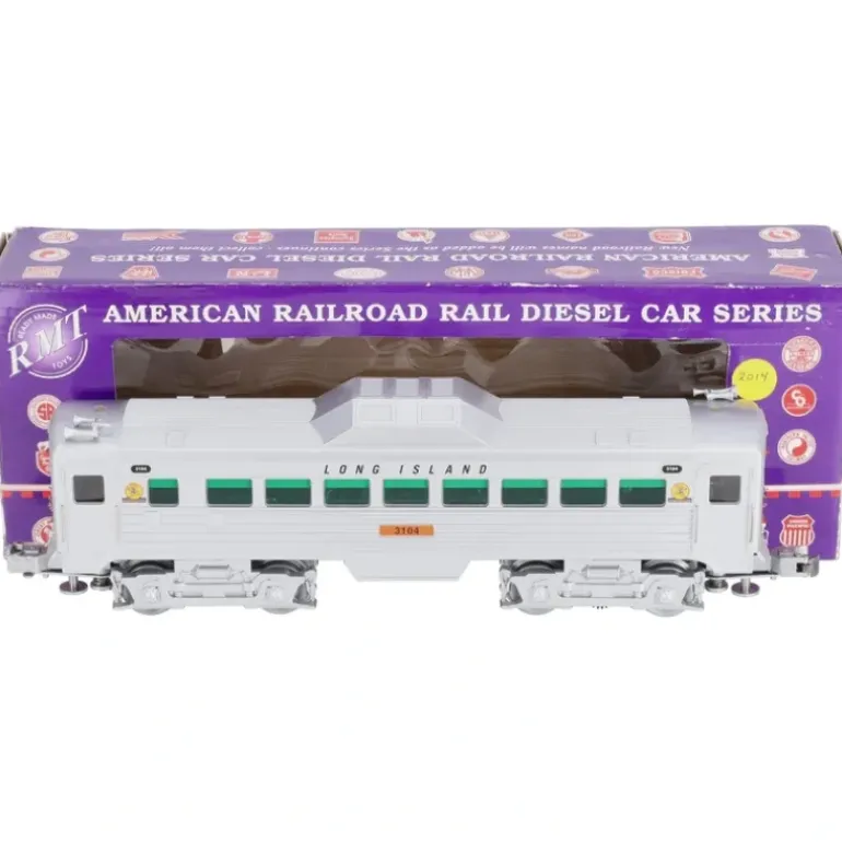 This is a RMT 5112 Long Island BUDDY Powered Diesel Loco #3104. RMT BUDDY’s are smaller-sized RDC commuter cars and are compatible with Lionel, K-line, MTH, Atlas, Williams and Weaver electric trains, this BUDDY Rail Diesel Car/RDC is 13 inches long and perfect for use on all O and O-27 3-Rail model train layouts. It will operate on 0-27 radius curves. The BUDDY features 2 motors, electronic reverse F-N-R, front/rear directional headlights/marker lights, flashing roof beacon, operating knuckle couplers, cab detail with seated engineer figure, tinted windows, interior lights, metal hand rails – chains and metal chassis with multi-wheel electrical pickup. All BUDDY’s are Powered unit only, there were no non-powered units made.