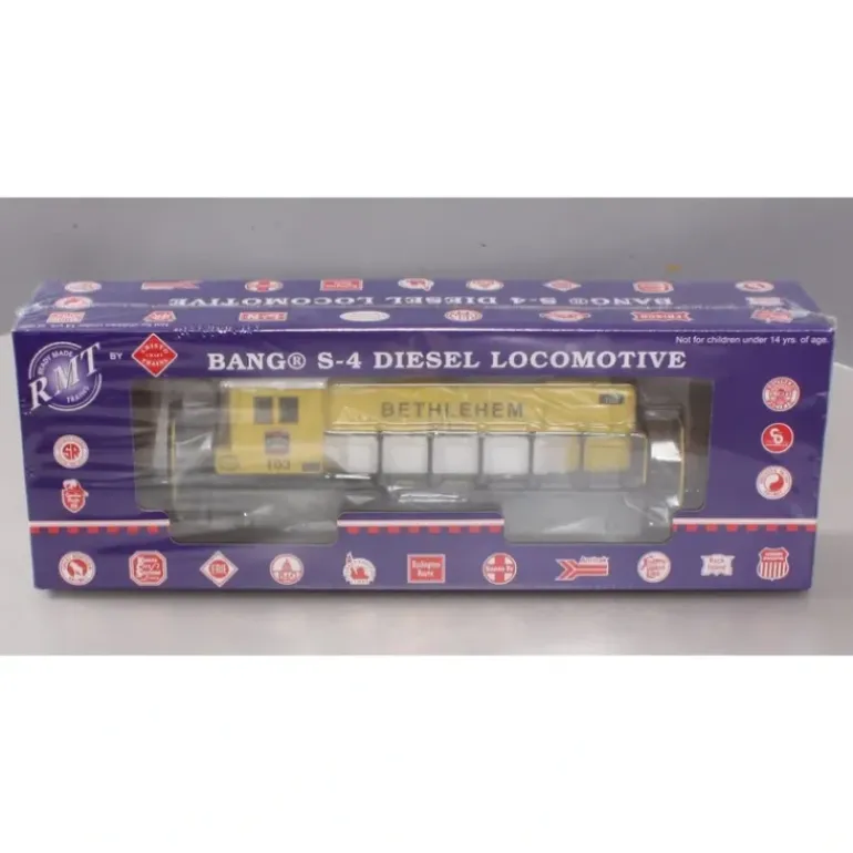 Here is a RMT 92319 Bethlehem Steel Alco S-4 Diesel Locomotive w/Horn Sound #103. Painted yellow with black lettering and multi-color BETH STEEL logo. The prototype for BS #103 was built by ALCO/American Locomotive Works, Schenectady, N.Y. and was used as a yard switcher in many locations at the Bethlehem Steel plant along the Lehigh River in Bethlehem, PA until retired and sold for scrap.