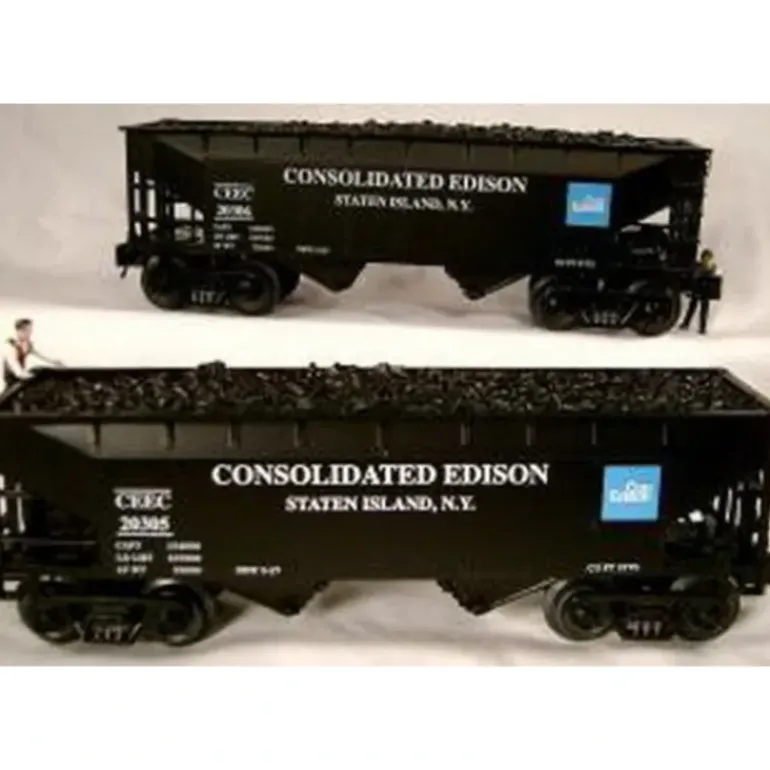 Realistic CON ED coal car colors of black with the distinctive ‘CON ED’ logo with lettering in white. Of special note is the sublettering for Staten Island, N.Y., the location of CON ED’s Arthur Kill coal-fired generating plant. Length 9 1/2 inches long over couplers, Realistic painting, Prototypically inspired lettering on sides AND ends, Opening hopper doors, Metal brake wheel, Metal trucks w/metal sideframes and spring detail, Operating diecast couplers w/air brake hose detail, ‘Easy-roll’ metal wheels, Removable coal load, A separate standing BEEPeople brakeman figure.