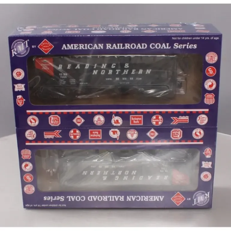 Here is a RMT 96212 O 2-Bay Hopper Reading Northern/2pk. The Reading Blue Mountain and Northern Railroad (reporting mark RBMN) is a shortline railroad operating in eastern Pennsylvania. Length 9 1/2 inches long over couplers