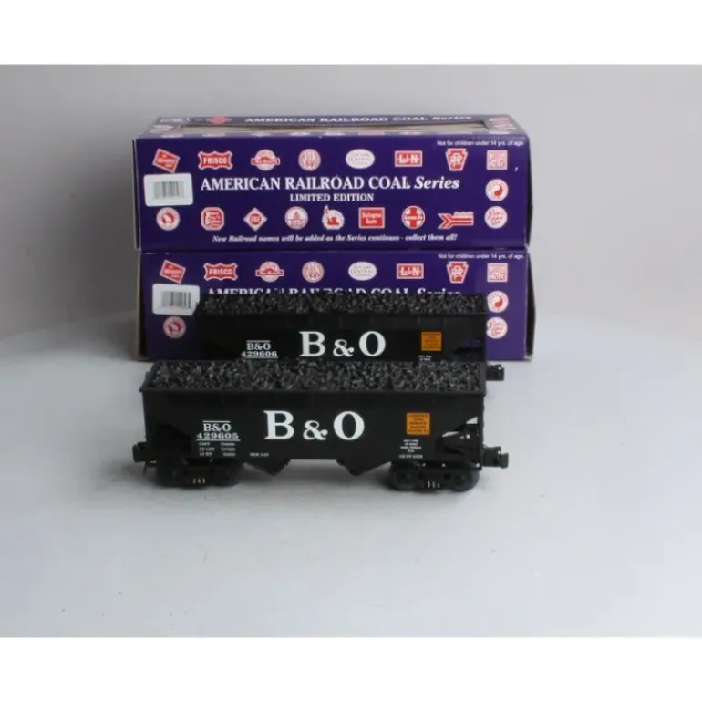 Here is a RMT 962232 O Gauge Baltimore & Ohio 2-Bay Coal Hopper Set. It features plastic construction, plastic trucks, metal wheels, metal axles, operating knuckle couplers.