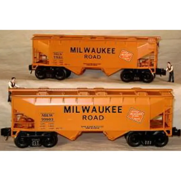 Here is an RMT 96316 Milwaukee Road 2-Bay Covered Hopper 2-Pack. Each car features die-cast metal sprung trucks, operating knuckle couplers, metal wheels and axles.