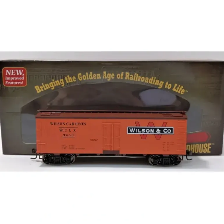 Here is a Roundhouse 85506 HO Wilson & Co 36′ Meat Reefer #9458. This car comes fully assembled and ready for your layout. It features factory installed wire grab irons, wire truss rods, razor sharp painting and printing, body mounted couplers, machined RP25 profile 36 inch metal wheels, and McHenry scale knuckle spring couplers.