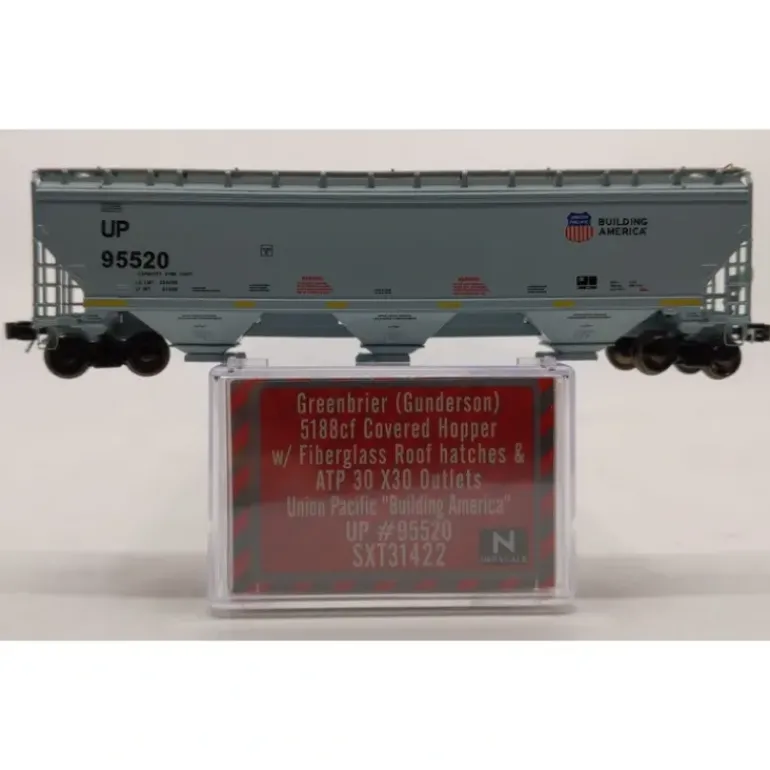 Here is a Scale Trains SXT31422 N Union Pacific Gunderson 5188 Covered Hopper Car #95520. This product features a plastic construction with metal wheels and operating knuckle couplers.