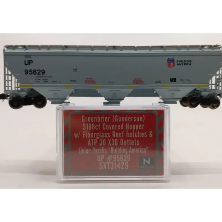 Here is a Scale Trains SXT31429 N Union Pacific Gunderson 5188 Covered Hopper Car #95629. This product features a plastic construction with metal wheels and operating knuckle couplers.