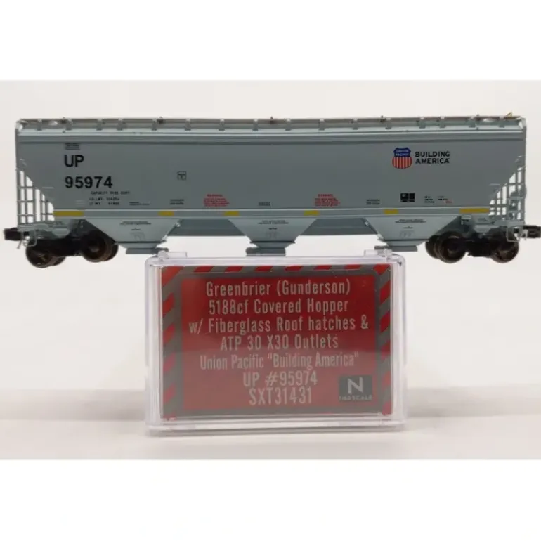 Here is a Scale Trains SXT31431 N Union Pacific Gunderson 5188 Covered Hopper Car #95974. This product features a plastic construction with metal wheels and operating knuckle couplers.