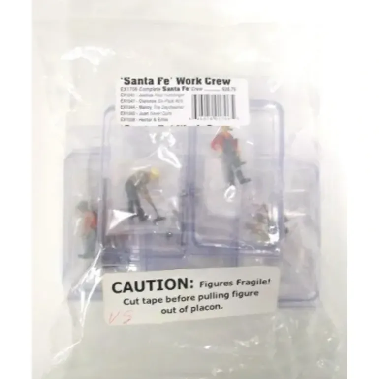 Here is a Scenic Express EX1706 Santa Fe Work Crew O Scale Figures. There are 5 figures included. They are painted and measure approximately 1-1/2 ” to 2″ tall.