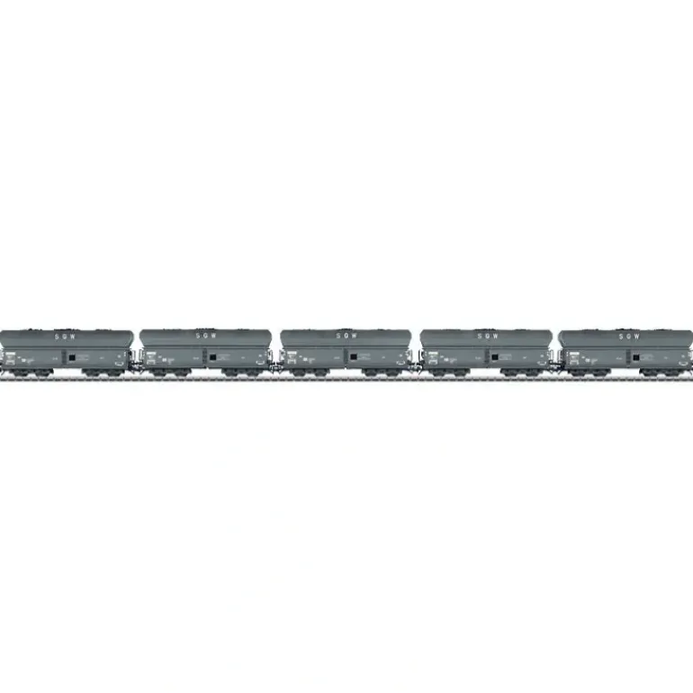 This is a Trix 24516 SGW Coal Hopper 5-Car Set. These high-capacity hoppers were privately owned cars painted and lettered for the firm SGW, used on the French State Railways (SNCF). They were used in unit trains for transporting coal. The saddle, frame and end platforms on the cars are made of metal. They each have different lettering and car numbers. The load inserts have a layer of real, scale-sized coal and the cars are painted to look dirty from use. Each car comes individually packaged. They have NEM coupler pockets and a close coupler mechanism. The length over the buffers for each car is: 5-1/4, and the total length is: 26-3/8.