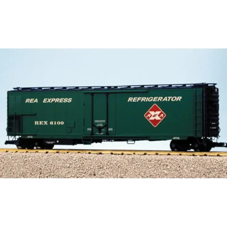 This is a USA Trains 16723 G Railway Express Agency 50′ Mechanical Refrigerator Car #6100. Features include a sliding grated door, opening plug door, full underbody detail, fuel tanks with gauges and metal wheels.