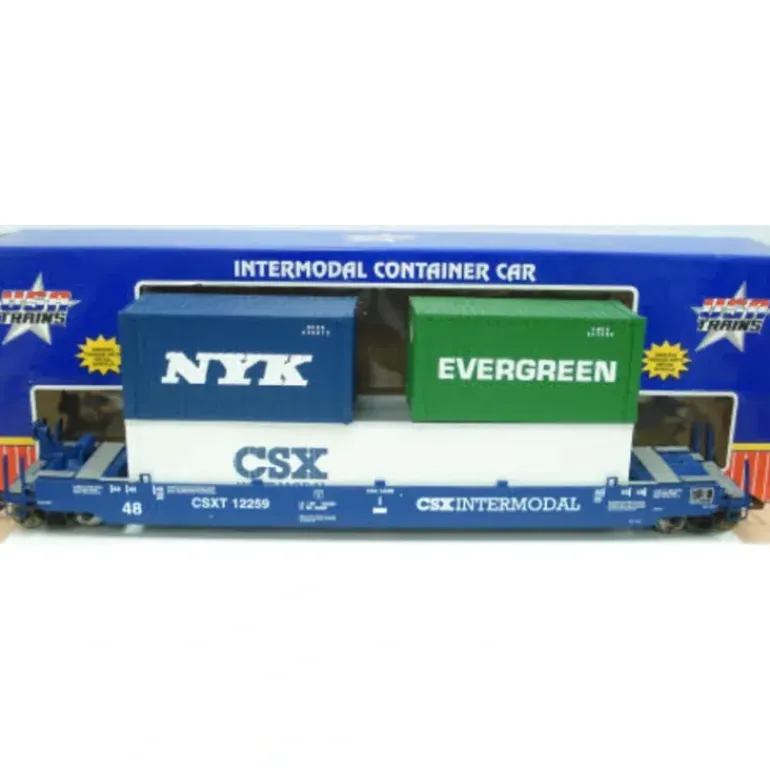 This is a USA Trains 17129 G CSX Gunderson Husky Stack with 2 Containers #1. This features Real Brass Coupler Lift Bar, Real Brass Walkway, Real Brass Chain on brake, Real Brass brake rod assembly, runs the length of the car, Detailed Brake system, opening doors, separately molded grab irons and corner steps, both hook/loop and knuckle couplers provided in the box, authentically detailed 125 tom sprung ruller bearing style trucks, Blackened metal wheels, and Approximate length is 28.5.