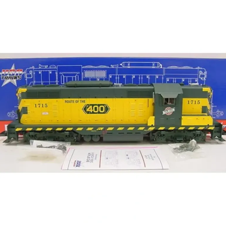 This is a USA Trains 22104 G Chicago & North Western GP-7 Diesel Locomotive #1715. This locomotive features two powerful motors, 8-wheel PowerTrac drive system, operating smoke stacks, detailed cab interior, latch couplers, metal hand rails, interior lights, directional lighting and quality graphics. It measures approximately 23 inches long.