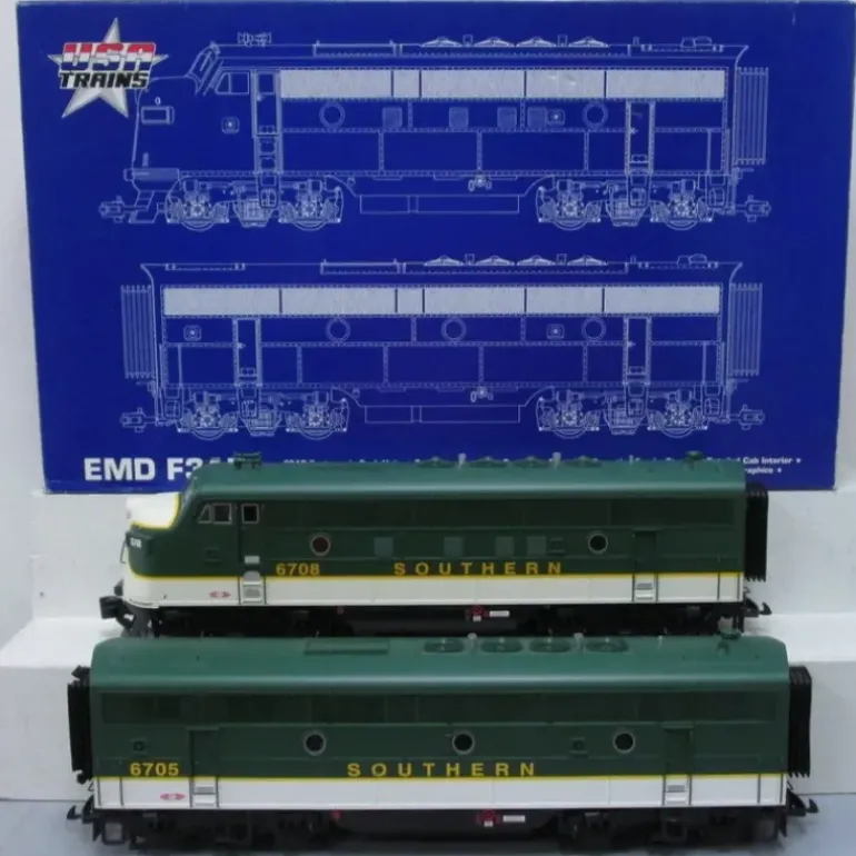 This is a USA Trains 22259 G Southern Railway F-3 AB Diesel Locomotive Set. Model features dual powered trucks on both units, dual smoking stacks on both engines, back-up light on B unit, red/green directional marker lights, real metal screens on roof and side and lighted number boards. Models measure 20-3/4 in length and 5-3/4 in height.