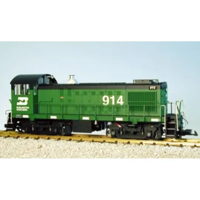 This is a USA Trains 22559 G Burlington Northern ALCO S4 Switcher Diesel Locomotive #914. This features Dual Motors, opening doors, Fan driven smoke exhaust, Lighted cab interior with engineer, Lighted number boards, Operational directional headlight, Metal handrails, highly detailed graphics including builders plate, and 17.25 inches.