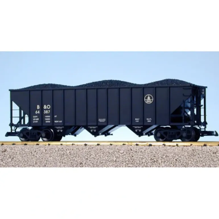 This is a USA Trains 14023 G Baltimore & Ohio 70-Ton 3-Bay Coal Hopper with Coal Load #64387. Each hopper features opening bottom hatches, detailed brake system, coal load and metal wheels. Cars are Kadee coupler-compatible.