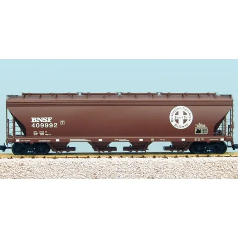 This is a USA Trains 14103 G Burlington Northern Santa Fe The Ultimate Series 4-Bay Center Flow Hopper. This features, opening bottom hatches, Detailed brake system, Different style opening roof hatches to match prototypes, Die-cast trucks with spinning wheel journal, Metal wheels, Die-cast metal coupler, and Length approximately 23.