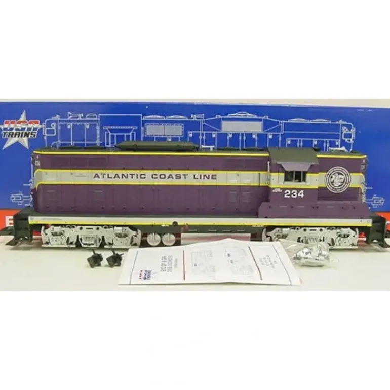 This is a USA Trains 22103 G Atlantic Coast Line GP-7 Diesel Locomotive #234. This features Dual Motors with Power Trac Drive System, Dual Operating Smoke Stacks, Detailed Cab Interior with Engineer, Operating Cab Door, Interior Lights, Metal Handrails, Red/Green Directional Marker Lights, and Approximate Length: 22.67, Width: 3.84 Height: 5.69.