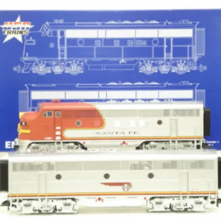 This is a USA Trains 22257 G Santa Fe F3 AB Powered Diesel Locomotive Set. Model features dual powered trucks on both units, dual smoking stacks on both engines, back-up light on B unit, red/green directional marker lights, real metal screens on roof and side and lighted number boards. Models measure 20-3/4 in length and 5-3/4 in height.