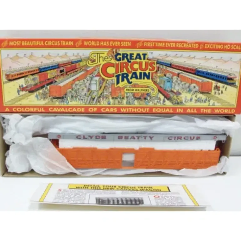 This is a Walthers 1967C HO Hagenbeck Wallace/Sells Stock Car # 49 and Clyde Beatty/Sun Mount Vernon Flat Car # 62 Kit.