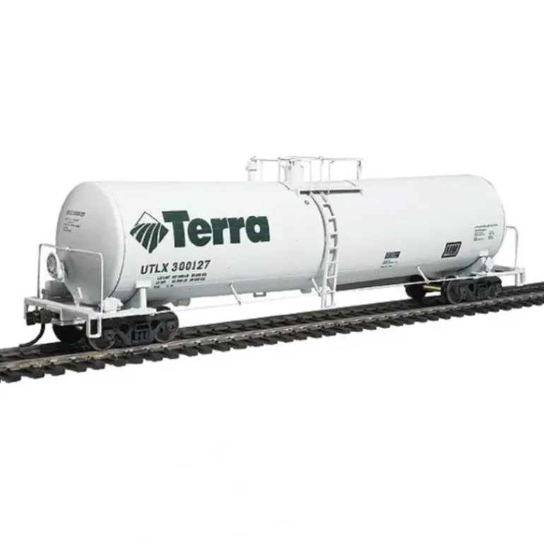 This is a Walthers 932-7270 HO UTLX Terra 23K Gal Funnel Flow Tank Car #300127. Ready-to-run models feature styrene bodies, metal handrails (where appropriate), razor-sharp painting and printing, free-rolling trucks and knuckle couplers.