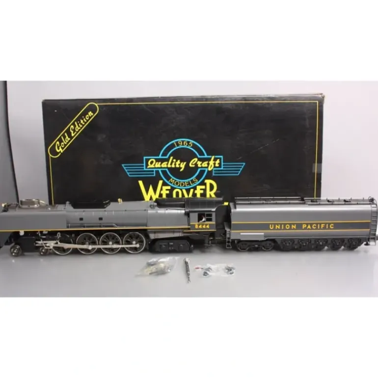 Here is a Weaver 8444 O Union Pacific BRASS FEF-3 4-8-4 Northern Steam Locomotive and Oil Tender #8444. It features painted brass construction, a can motor, smoke deflectors, a constant voltage headlight, metal wheels, an automatic coupler and operating backup, and a marker light on the tender. It does not have a sound system.