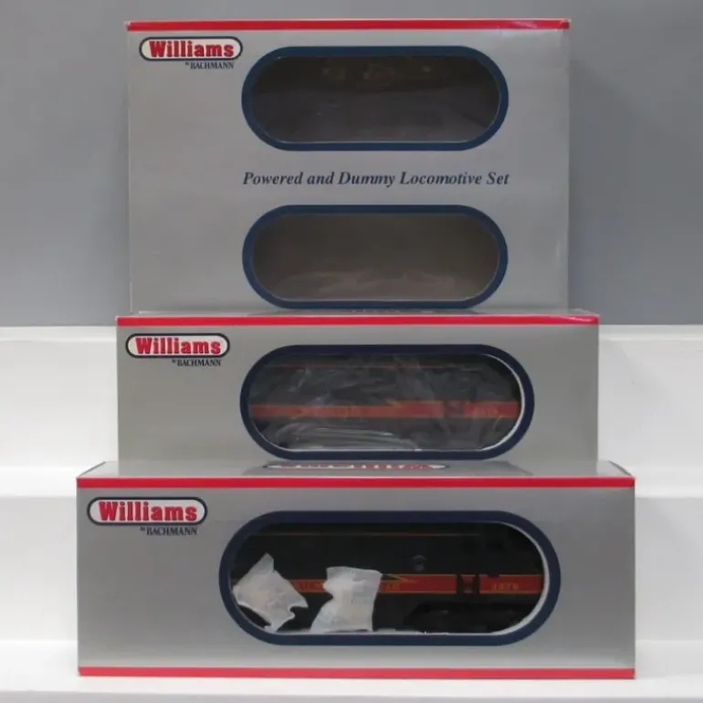 Here are a pair of Milwaukee Road F3 diesel locomotives. Included are a powered and a dummy A unit. Each one features die-cast metal trucks, operating knuckle couplers, side portholes, metal decorative horns, working headlight, lighted number boards and die-cast fuel tanks. The powered unit features forward and reverse operation. Road number 2378. They run on O or O-27 curves.