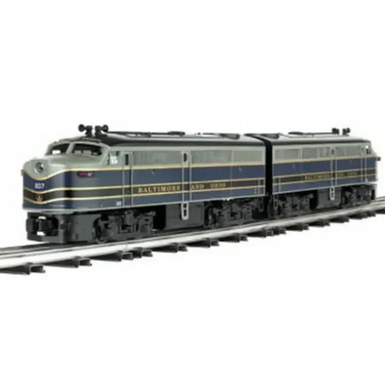 Here is a Williams 20901 O Gauge B&O FA-1 Diesel Locomotive AA Set. Included are a powered and a non powered unit. The Locomotives feature a metal frame with plastic shell, ornamental horns, operating headlights, die-cast truck sides, front and rear operating knuckle couplers and metal wheels and axles.