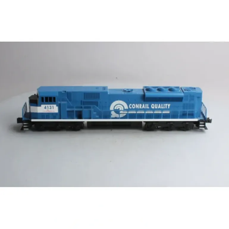 This is a Williams 21801 Conrail SD90 UP Diesel Locomotive. This Locomotive features dual motors with flywheels, 6-wheel powered trucks with all metal gearing and traction tires. It laso has an electronic 6-amp reverse board, True Blast II digital horn and bell, a durable ABS plastic shell, dual headlights, stamped metal handrails, die-cast trucks, die-cast truck sides, die-cast pilots, and die-cast operating couplers. It runs on a minimum 0-31 curve track and it is 17.75 inches long.
