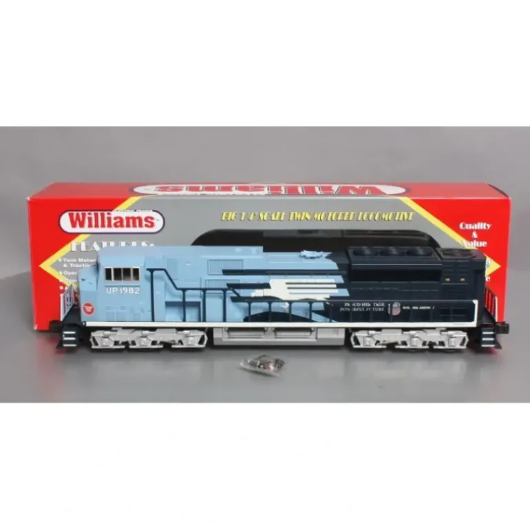 Here is a Williams 21810 Union Pacific Heritage SD90 Powered Diesel Locomotive #1982. In July 2005, Union Pacific Railroad announced that they would be decorating six special locomotives to honor the people and the companies of the major railroads that had merged with UP. Each locomotive number signifies the year that the railroad became a part of the Union Pacific system. Features Navigates 0-31 curves Length 17.75″, height 3.875″ 6 wheel power trucks with Traction tires Powered by dual motors Flywheel coasting action All metal gears Electronic 6-amp reverse board True Blast II” digital horn and bell Durable ABS plastic shell Die-cast trucks, truck sides, and pilots Die-cast operating couplers Dual lights Sturdy stamped metal handrails