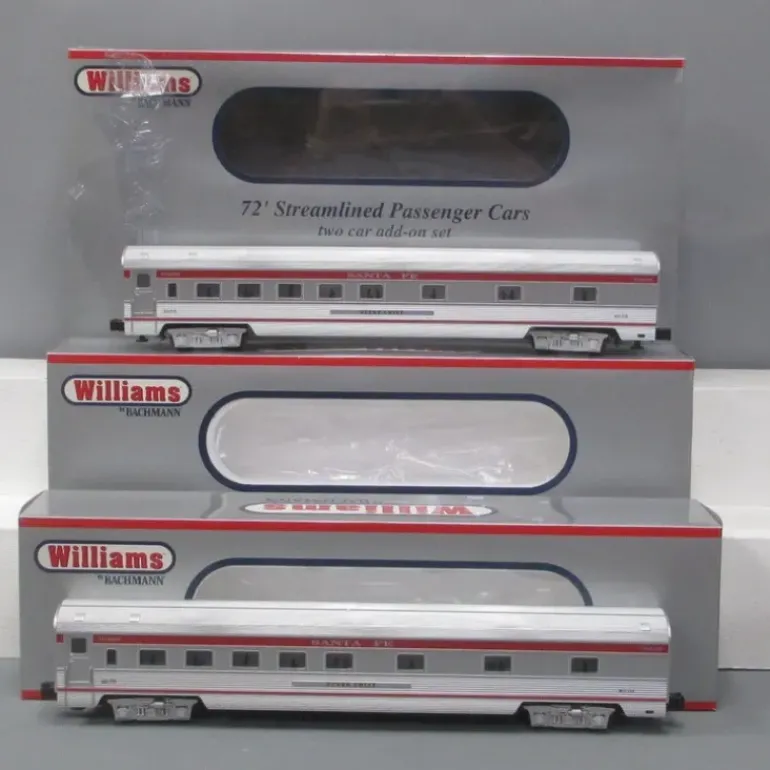 Here is a Williams 43110 Santa Fe 72′ Streamliners Passenger 2-Car Add-On Set. Features include navigates 0-42 curves, single-car length: 18, durable/lightweight ABS plastic shell, oil impregnated bearings, passenger silhouettes, dual roller pick-ups, operating couplers, needlepoint axles, interior lighting, two-car add on sets include 2 coaches, and they are Lionel compatible.