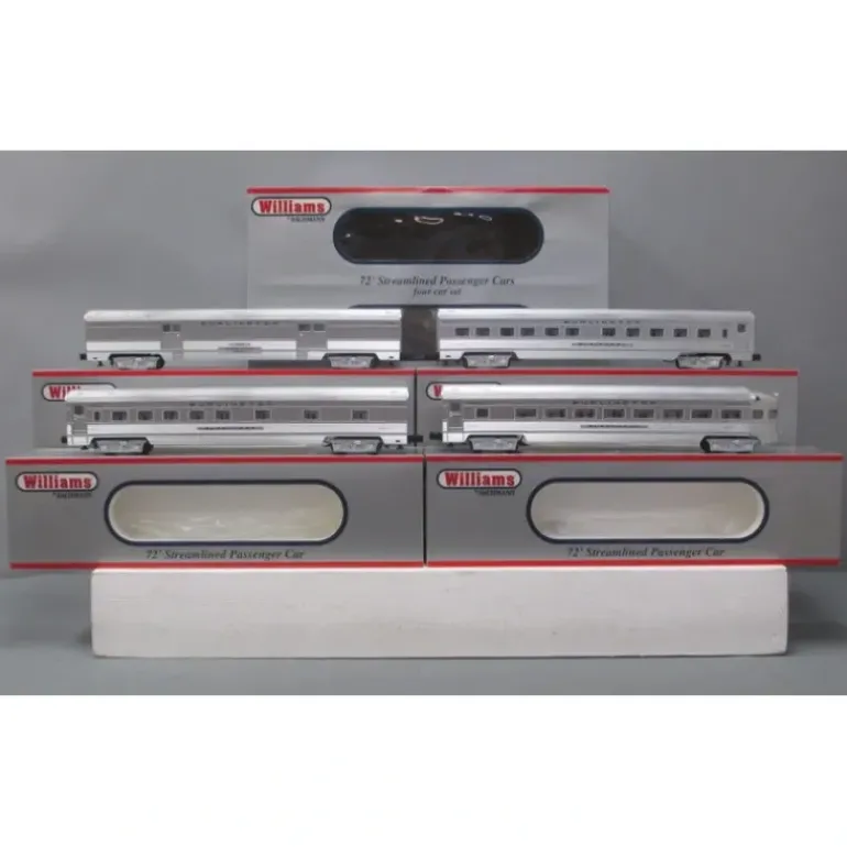 Here is a Williams 43154 CB&Q 72 Ft. Streamline Passenger 4-Pack Set. Navigates 0-42 curves , single-car length: 18″, durable/lightweight ABS plastic shell, oil impregnated bearings, passenger silhouettes, dual roller pick-ups, /operating couplers, needlepoint axles, interior lighting, four-car sets include 1 baggage car, 2 coaches, and 1 observation car.