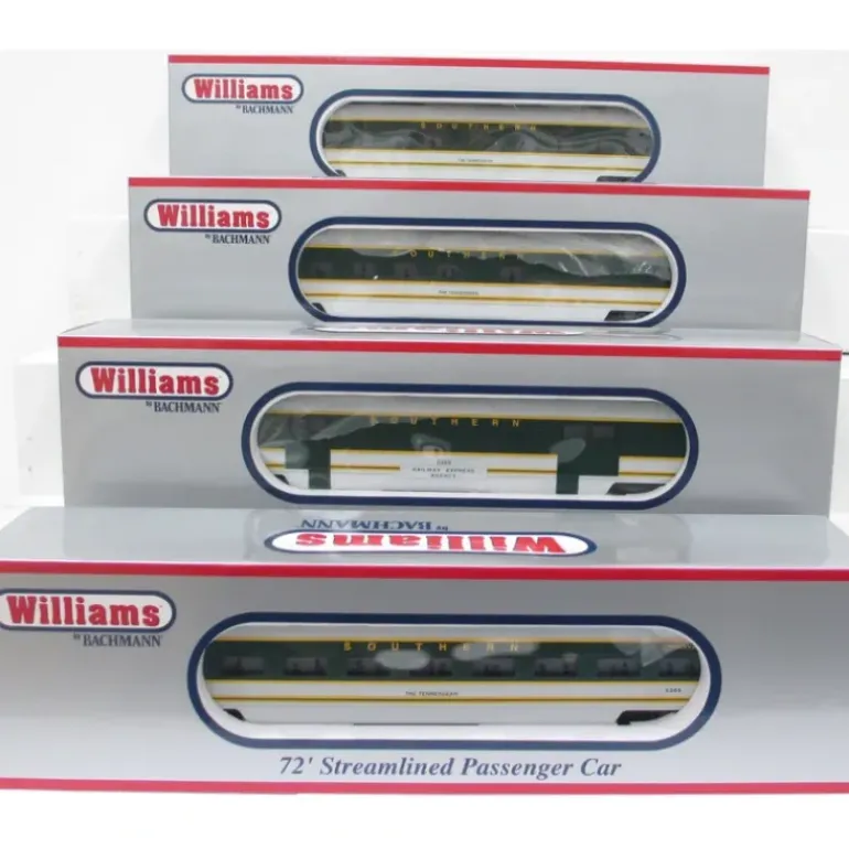 Here is a Williams 43161 Southern 72 Ft. Streamline Passenger 4-Pack Set. The Passenger Cars will navigate 031 curves. The cars measure 16 and the height is 3.5. They include durable ABS bodies, ABS car ends, passenger silhouettes in the windows, painted graphics, illuminated marker lenses in the observation car, operating baggage doors, die-cast 4-wheel trucks and operating couplers, dual lights in each car. They are a perfect match for PA, Sharks, F7 and FA1 diesels. The 4 car sets include one Baggage, two coaches, and one observation car.