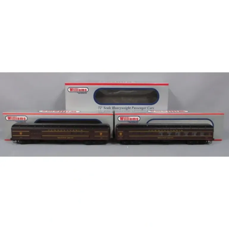 Here is a Williams 43303 PRR 72′ Heavyweight Passenger 2-Pack Set. These passenger cars navigates the 042 curves. Features include: single car length 17.75, height is 3.625, durable ABS plastic shell, die-cast trucks, needle point axles, die-cast operating couplers, fast angle powdered metal wheels, passenger silhouettes in windows, painted graphics, ABS undercarriage detail, perfect match for scale Hudsons, the two car sets include one combine and one diner cars, they also are Lionel compatible.