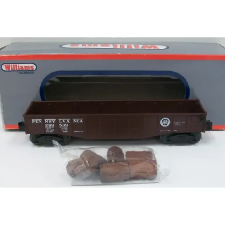 Here is a Williams 47204 O Pennsylvania Gondola with Barrels. This car features die-cast metal trucks, operating knuckle couplers, metal wheels and axles.